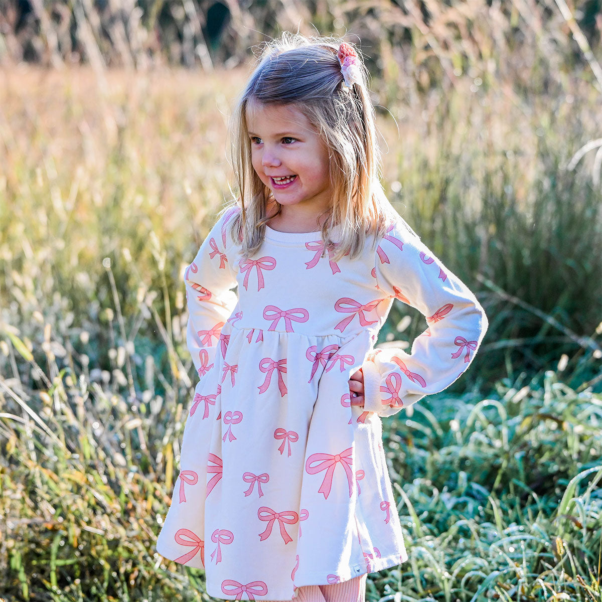 The comfy French Terry Josephine Dress includes long sleeves and is covered in sweet pink bows. It also features pockets and three buttons on the back to make dressing a breeze. Sizes available from 6 months to 5 years. Designed in Minnesota.