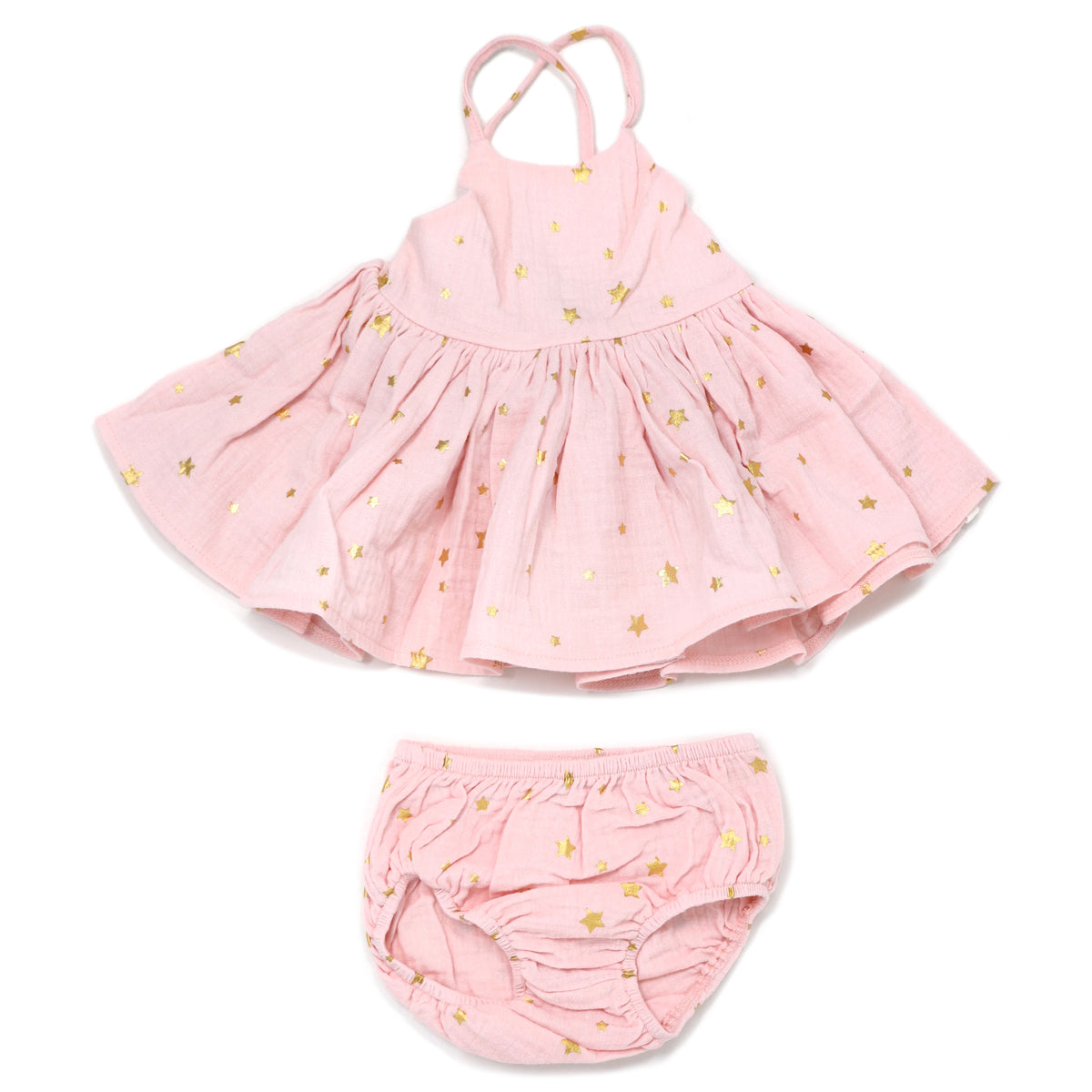 A strappy, flowing dress with all-over gold stars print. Available in infant, toddler and girls sizes. Great party dress for her next birthday or special event. Coordinating panties available up to size 2-3 yr. Designed in Minnesota.