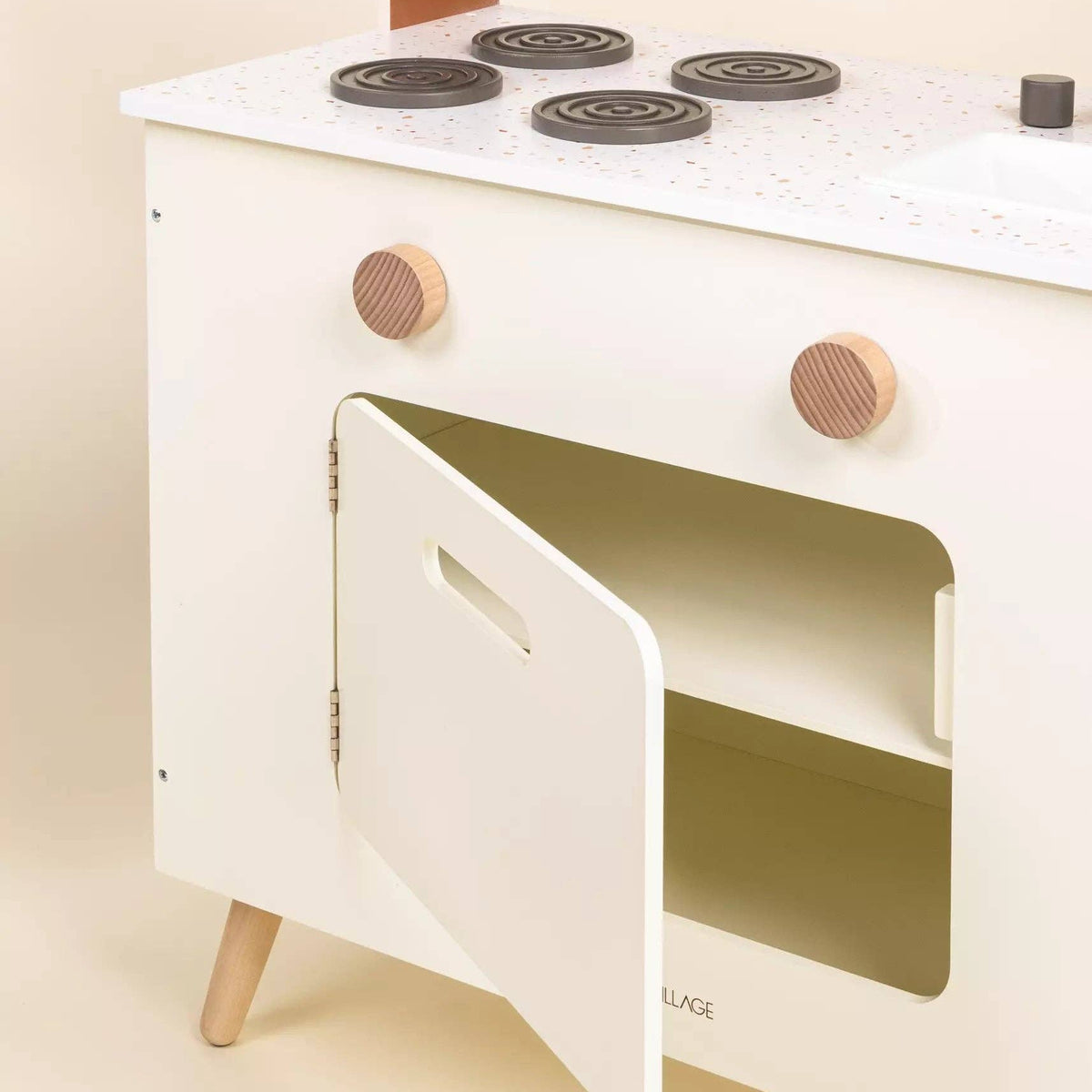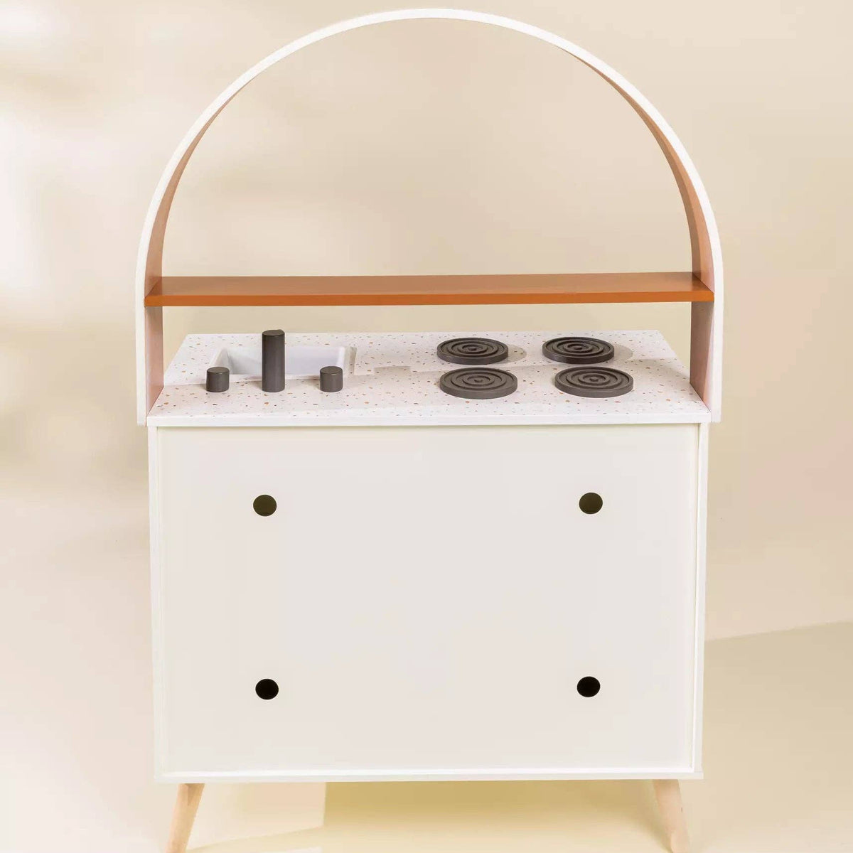 The Wooden Play Kitchen is so much fun! You’ll appreciate all the little details that give it a more realistic look, without compromising the product's sturdiness. Its colorful and retro design provides a unique style to it!