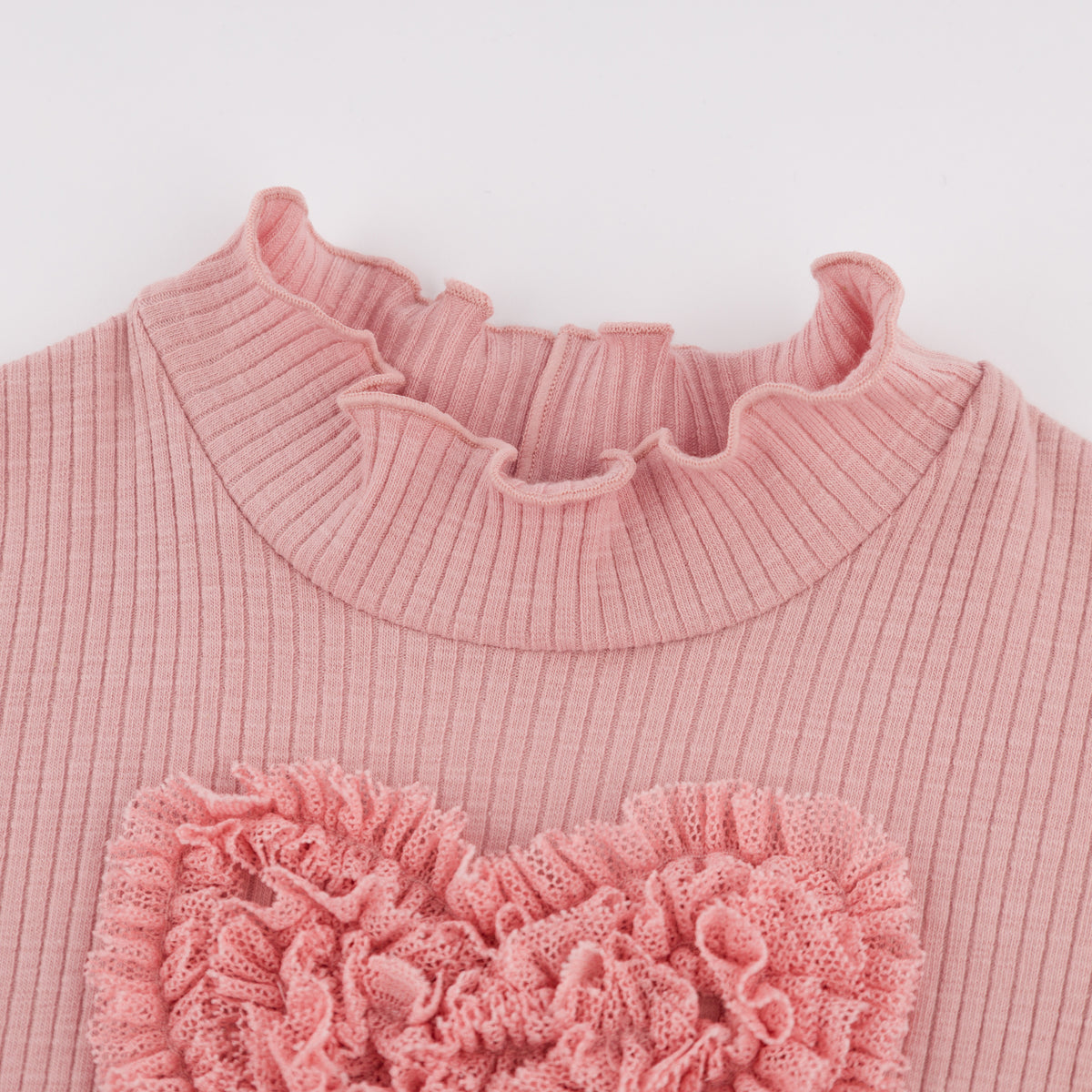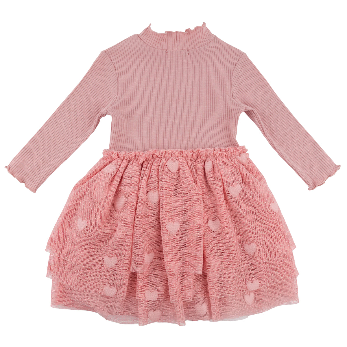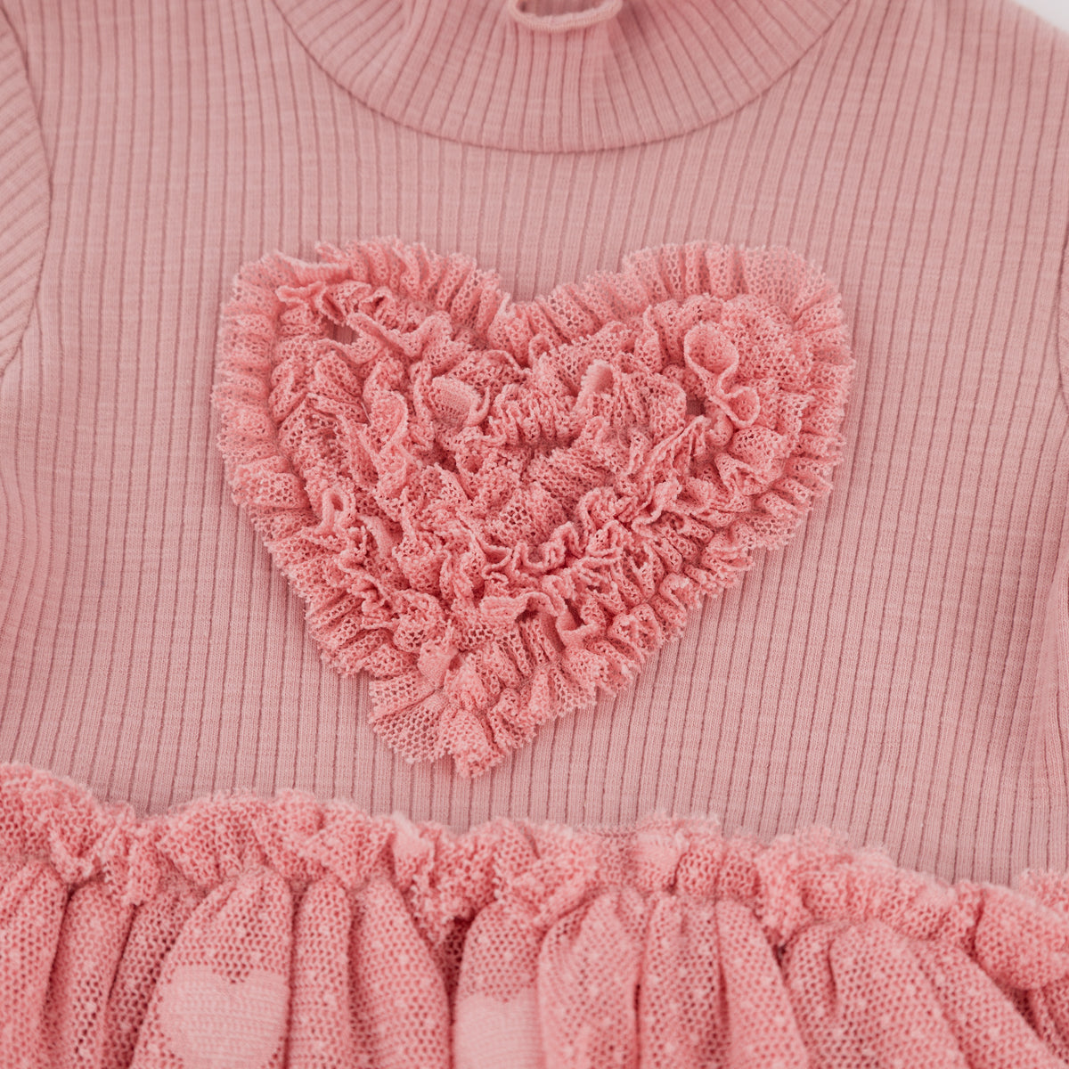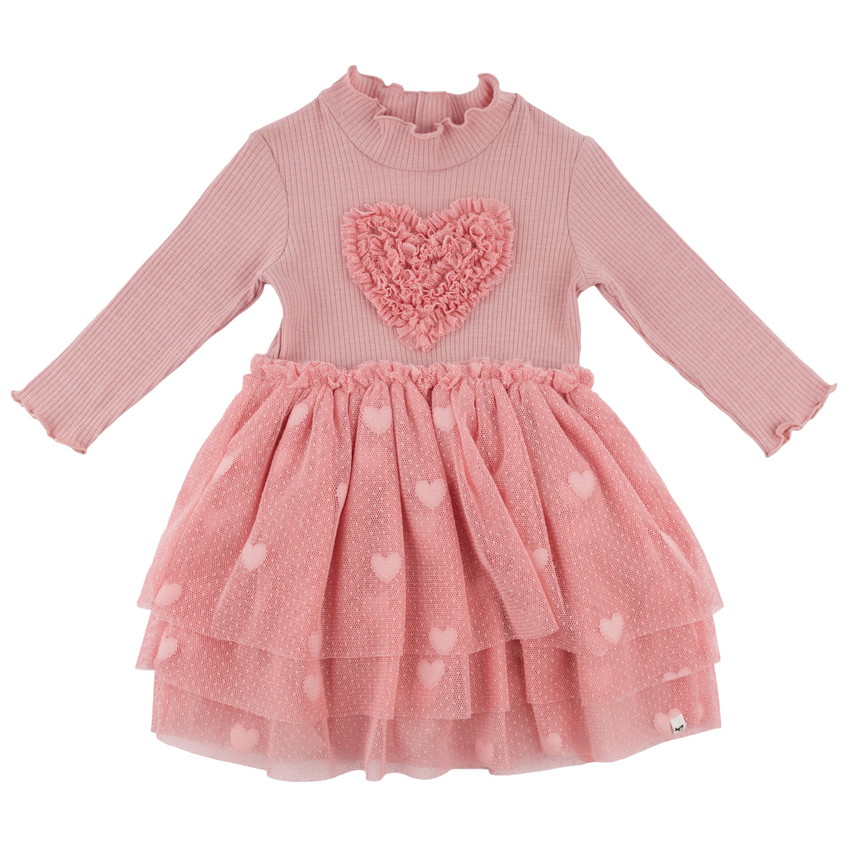 This playful oh baby! Aria Tutu Dress in blush features a cozy rib-knit mock neck top with long sleeves and a charming triple ruffle heart detail on the front. The full tutu skirt is layered with soft tulle, sprinkled with delicate hearts, adding twirls of fun and whimsy perfect for any special occasion or everyday dress-up. Available sizes from 6 months to 7 years. Designed in Minnesota.