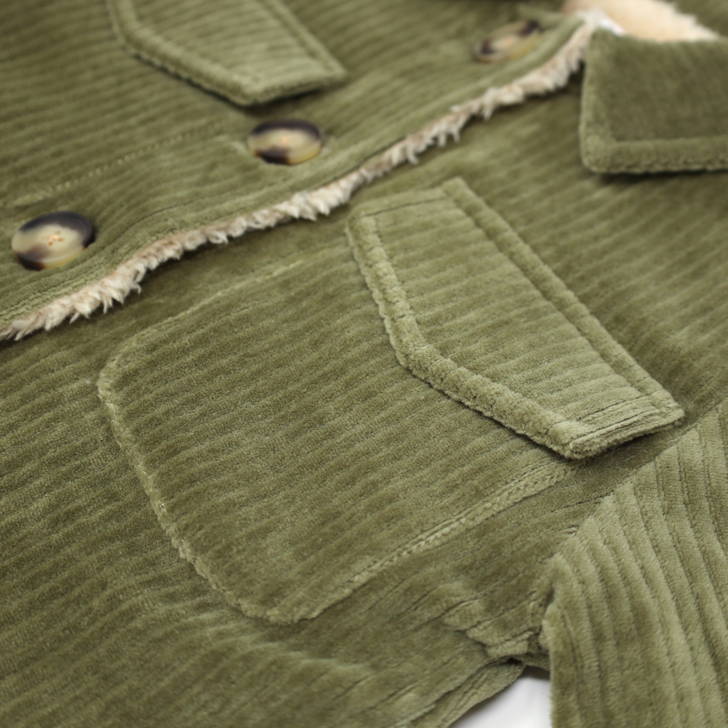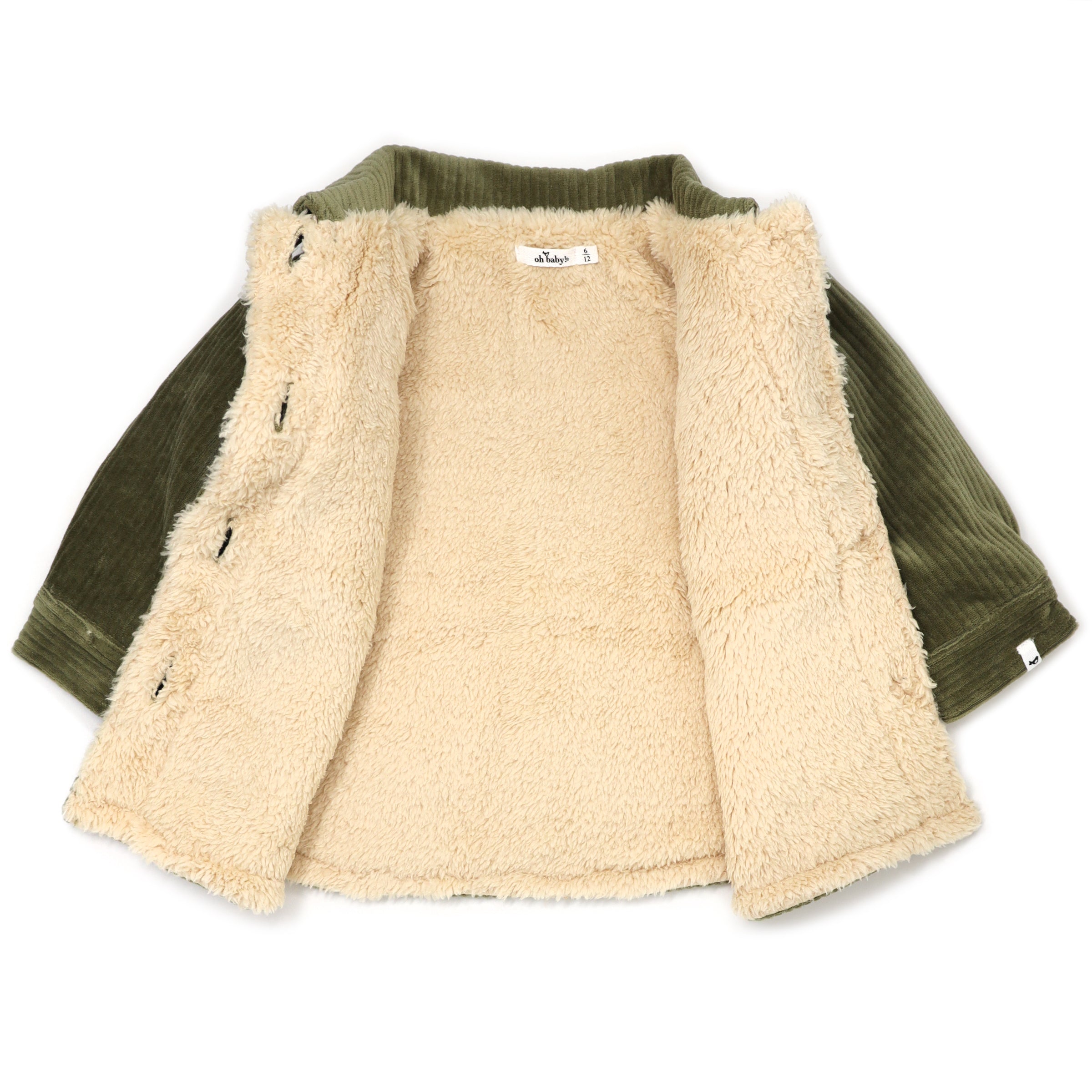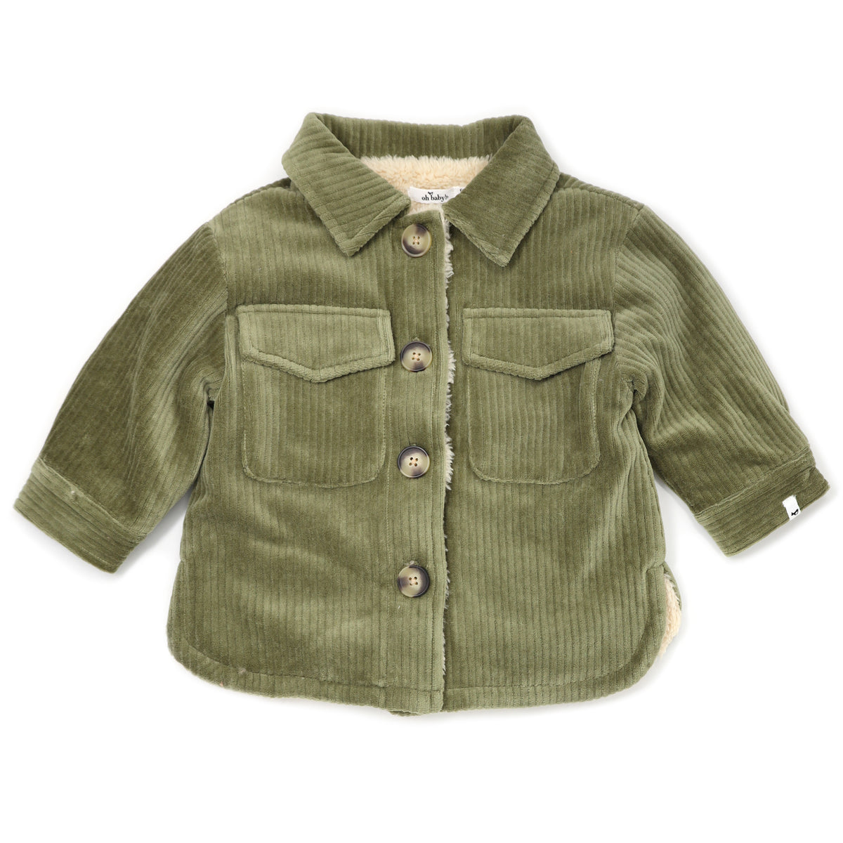 Cozy shirt / jacket hybrid, also known as a shacket. Moss green corduroy with a biscuit snowdrift fleece lining. Features buttons, a collar and 2 pockets. Available in infant, toddler and boys sizes. Designed in Minnesota.