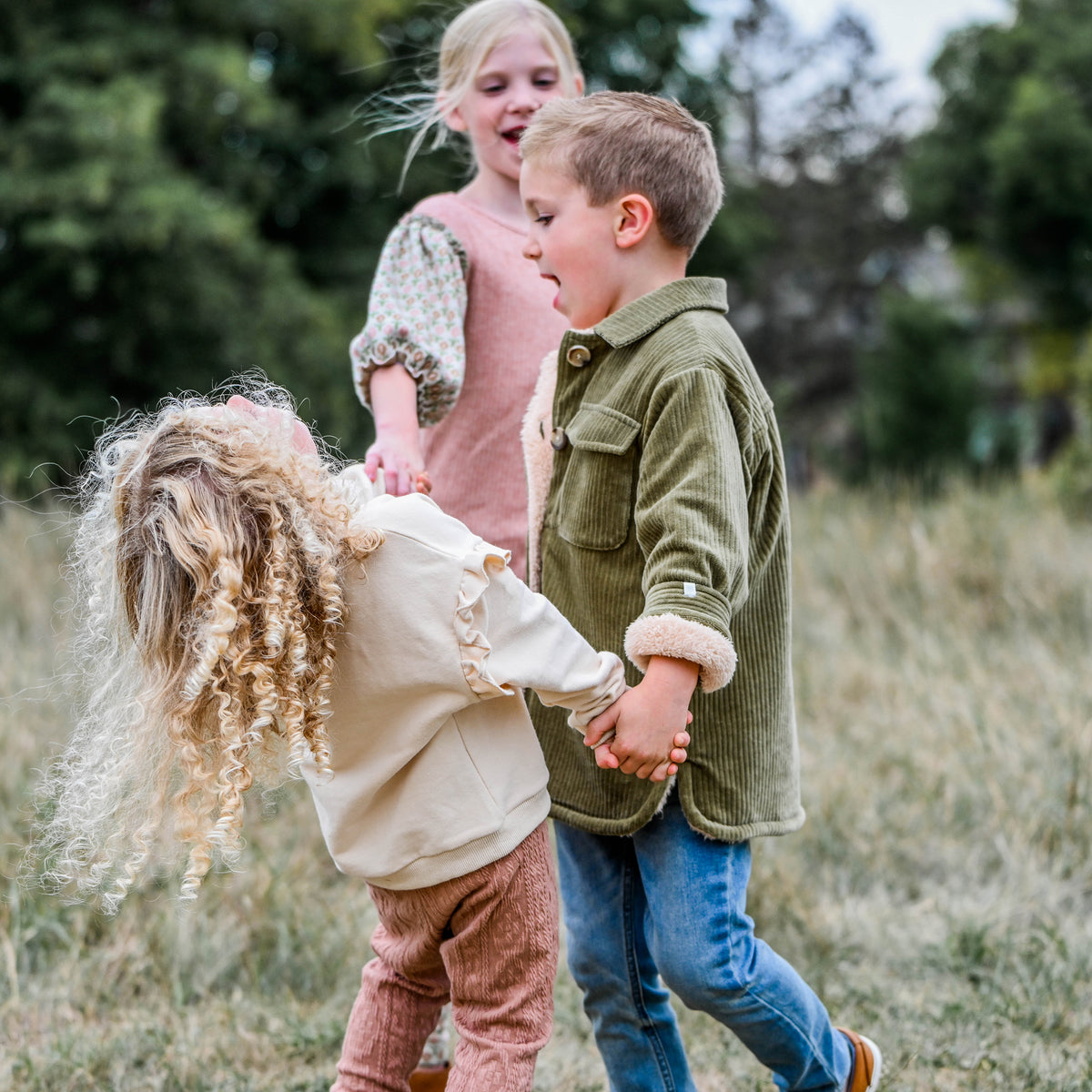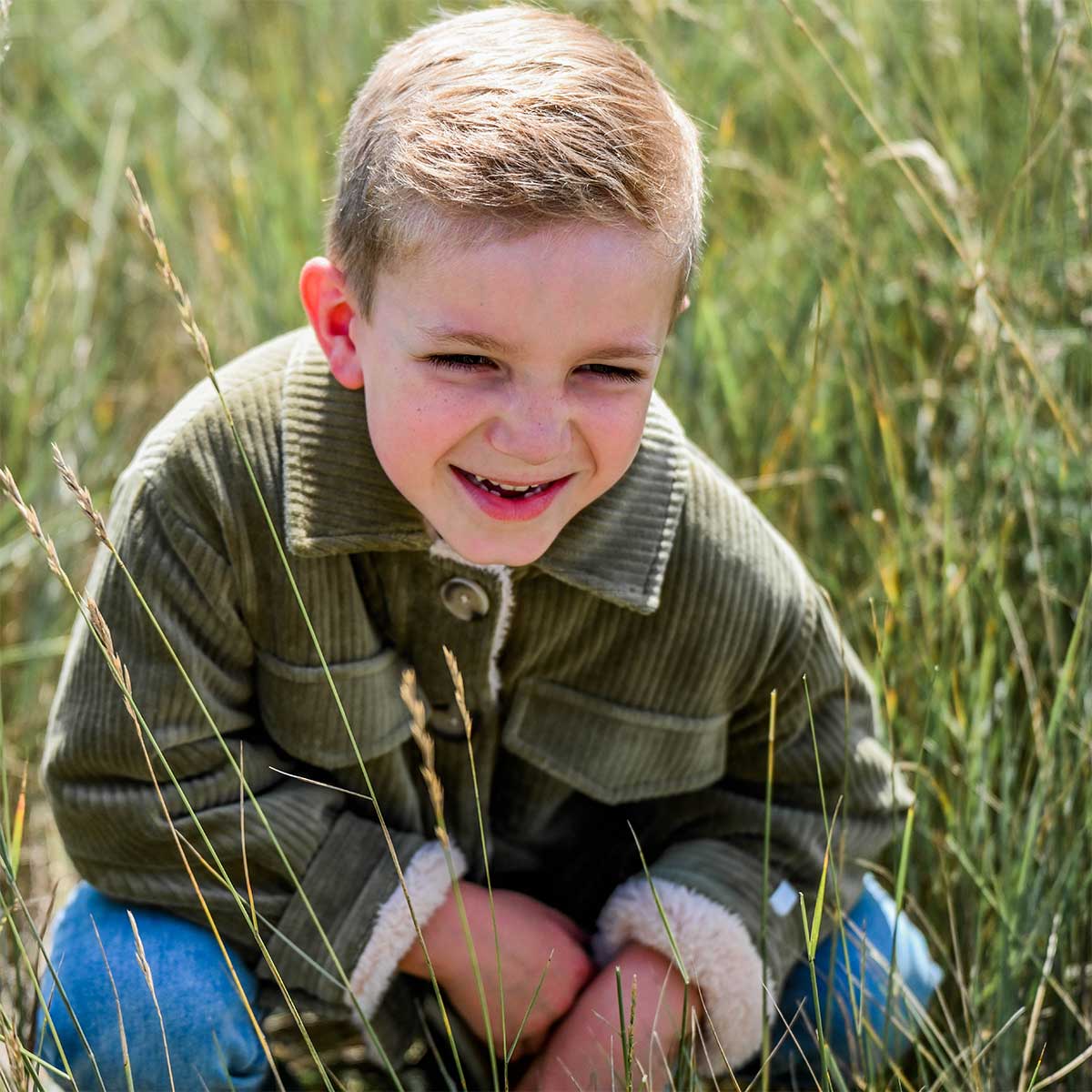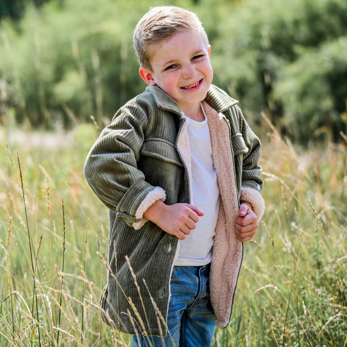 Cozy shirt / jacket hybrid, also known as a shacket. Moss green corduroy with a biscuit snowdrift fleece lining. Features buttons, a collar and 2 pockets. Available in infant, toddler and boys sizes. Designed in Minnesota.