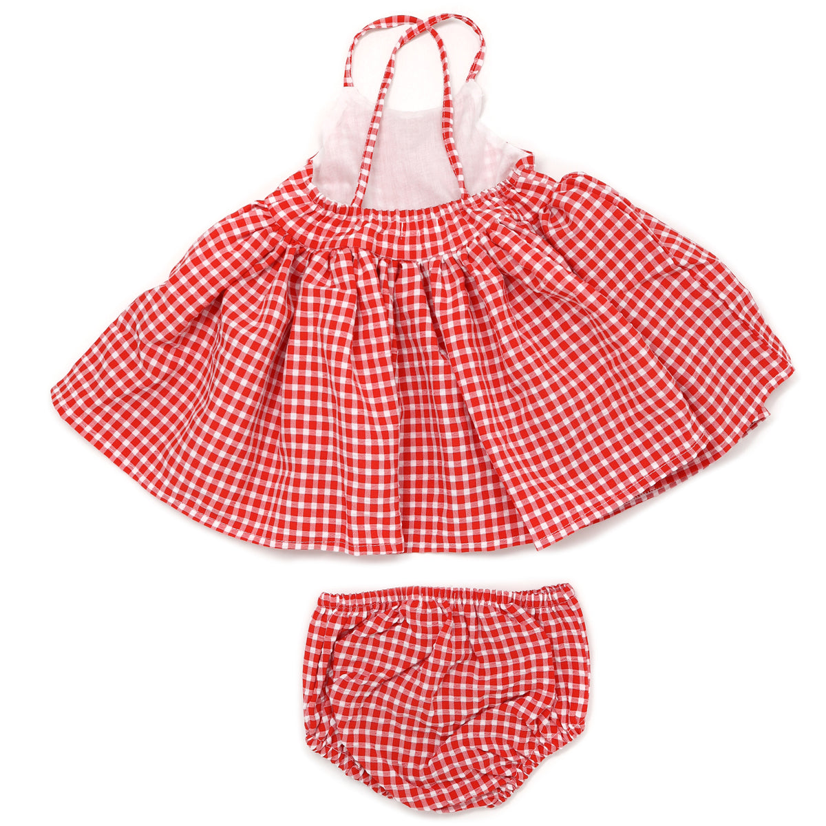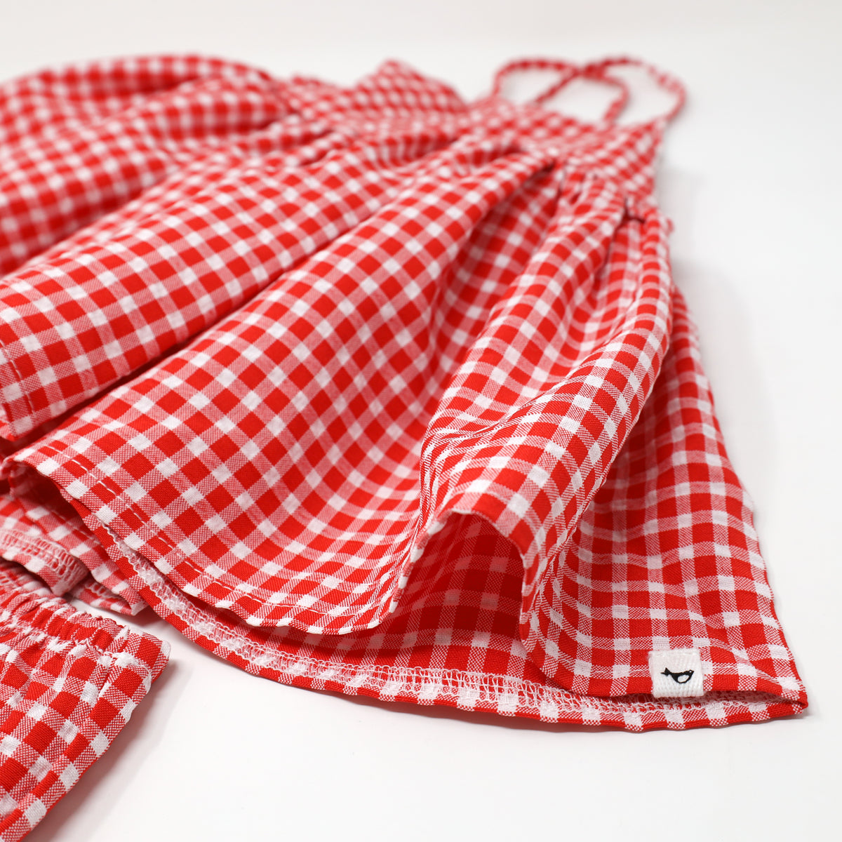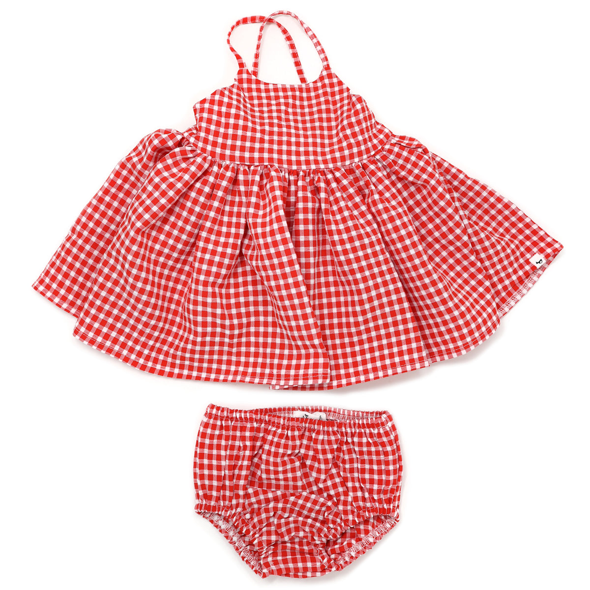 A strappy, flowing dress with gingham print. Available in infant, toddler and girls sizes. Coordinating panties available up to size 2-3 yr. Designed in Minnesota.