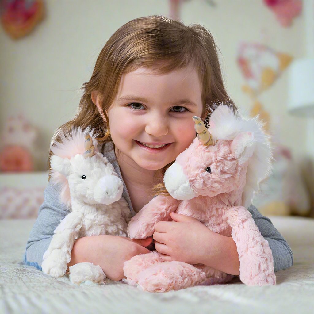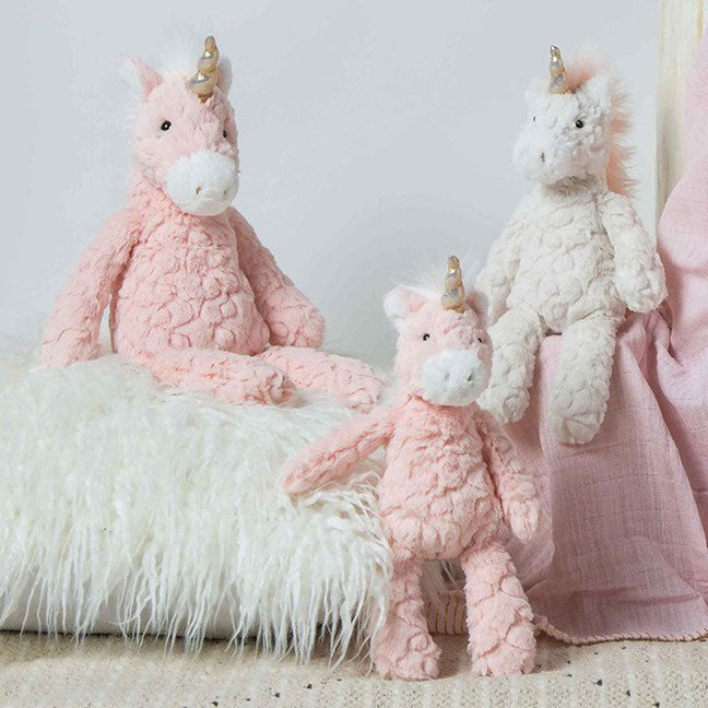 Blush Putty Unicorn is made of super soft, etched fabric in Blush pink. Features fluffy white mane and a soft padded metallic gold horn. Measures approximately 13-inches tall from the top of the head to the bottom of the feet. With lovely, warm colors and the sweetest smiles, Putty toys make oh-so-soft companions. A dab of Putty is enough to brighten every day. Weighted bums and feet add to the floppiness. Care for by washing in cold water on a gentle cycle, air drying; soft toy made to strict quality standards to meet or exceed US Safety requirements.