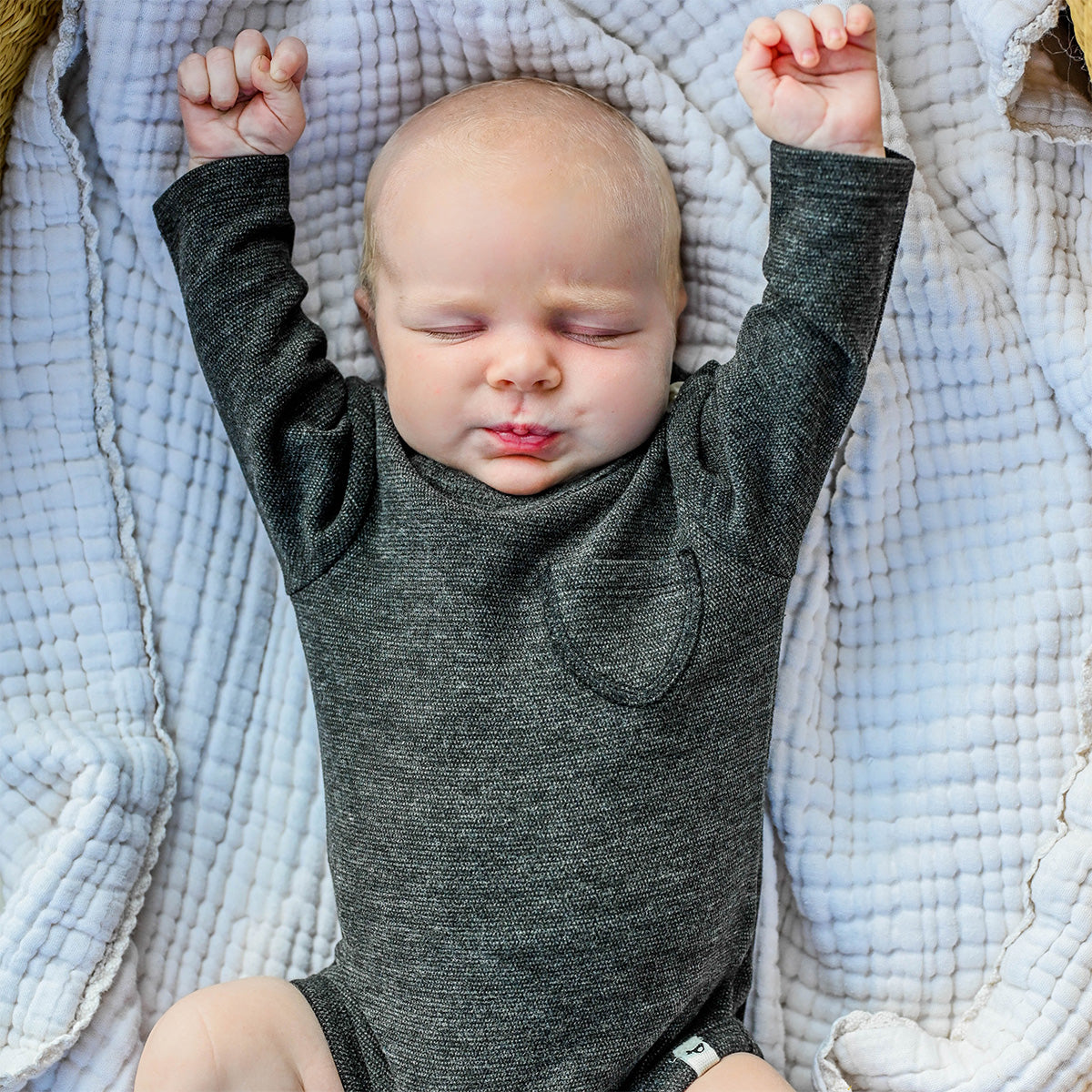This long sleeve onesie is crafted from ultra-soft honeycomb heathered knit fabric, featuring convenient snaps at the bottom and a shoulder button for effortless dressing. It includes a charming small pocket detail and comes in infant sizes. Designed in Minnesota.