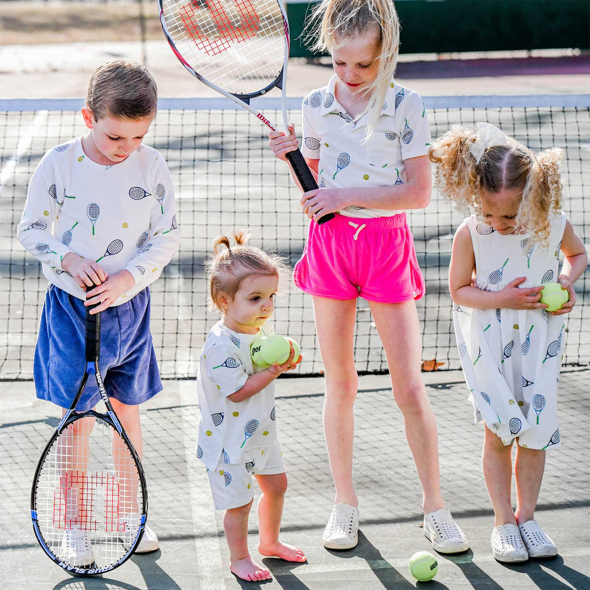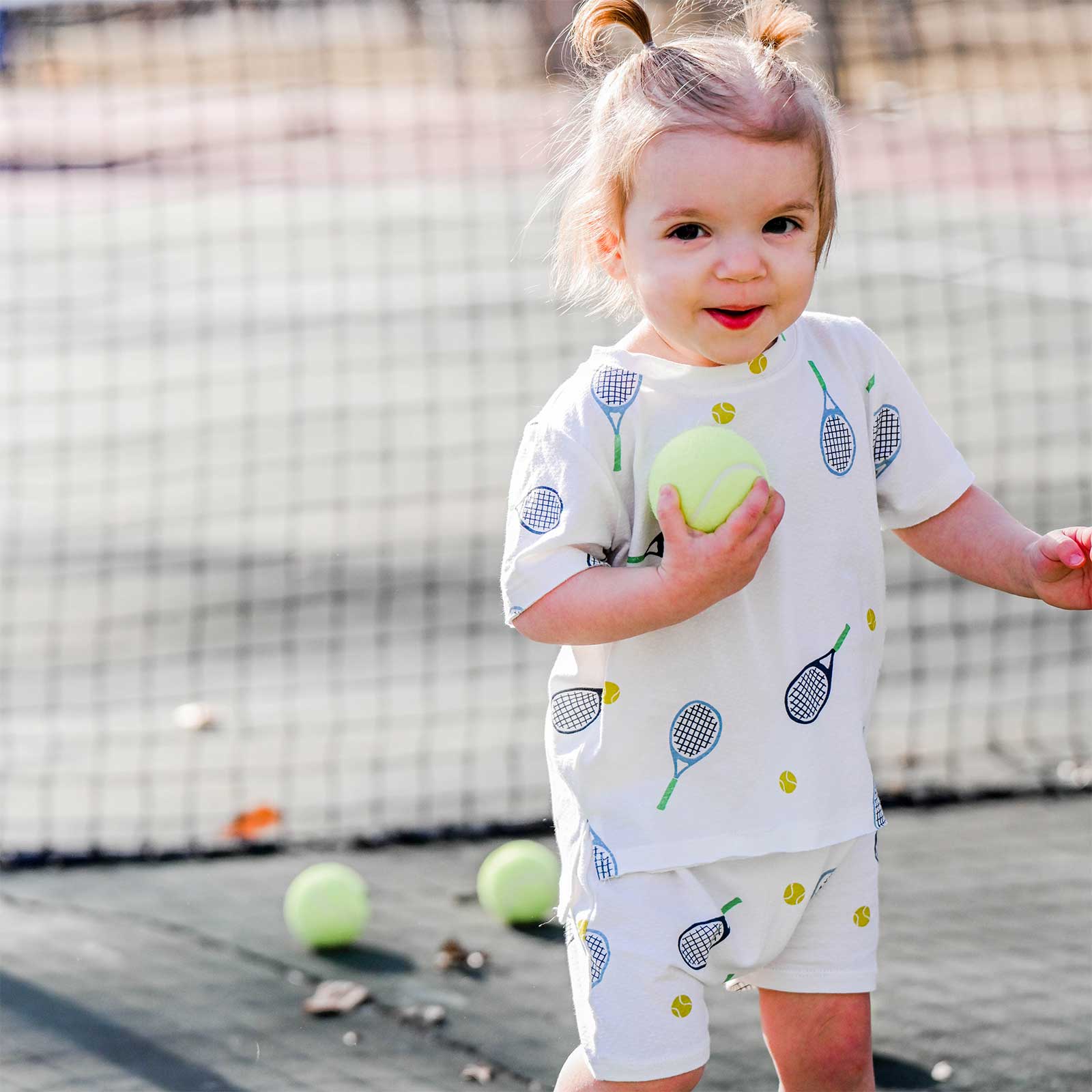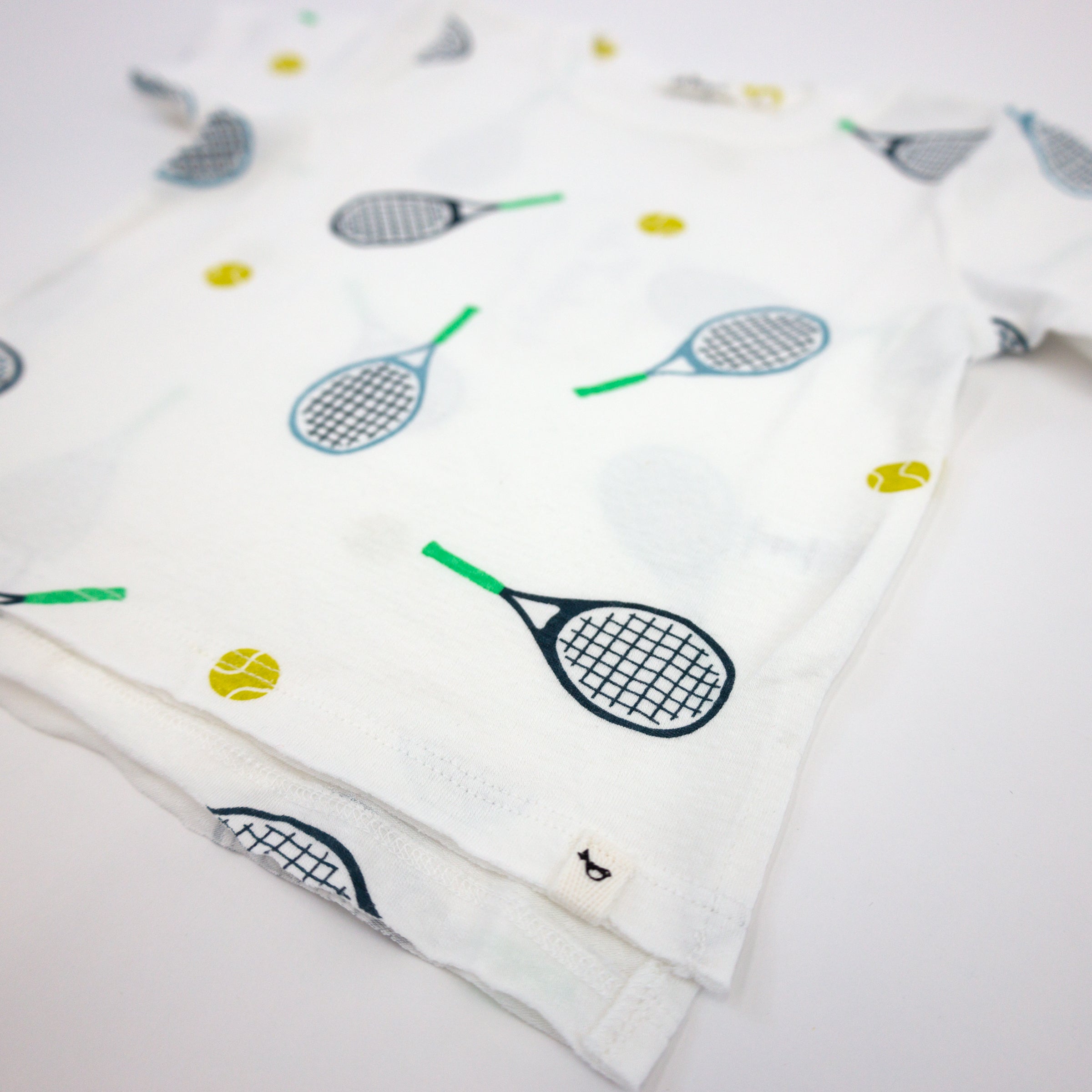 Our tennis print on a short sleeve, raw edge tee with coordinating elastic waist shorts. Designed in Minnesota. Available in infant and toddler sizes.